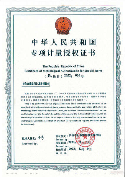 • 專(zhuān)項(xiàng)計(jì)量授權(quán)證書(shū)